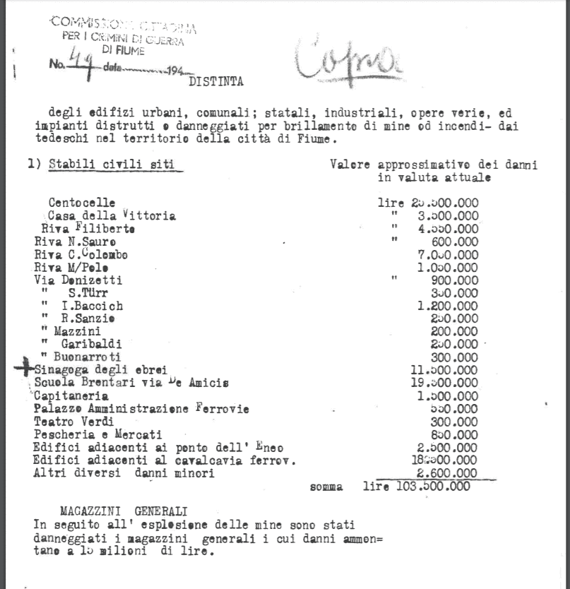 Pobrajajući samo preliminarne podatke o šteti na najvažnijim objektima, došli su do iznosa koji se broji u milijardama lira; samo razaranje luke procijenili su na 2,7 milijardi. Ovaj nalaz komisije za ratne zločine ne služi samo kao ilustracija za teško stanje Grada nakon povlačenja nacista. Iz nalaza je jasno kako je Zimmermann tretirao infrastrukturu, pa i vjersku. Spisu je, naime, priložen i popis “gradskih i komunalnih zgrada; državnih, industrijskih, različitih ustanova i postrojenja uništenih ili oštećenih miniranjem ili požarima koje su Nijemci napali na području grada Rijeke”. Na njemu je, među ostalim, i hebrejska sinagoga.