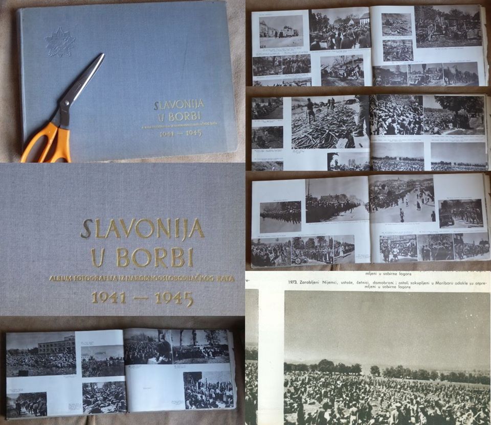 Ako se sagnem do najdonjeg reda stalaže, ondje je veliki fotoalbum „Slavonija u borbi“, debela knjižurina od pola metra širine. Podnaslov objašnjava o kakvom je izdanju riječ: „Album fotografija iz narodnooslobodilačkog rata 1941-1945“. Bilješka na kraju knjige/albuma kaže da je tiskanje završeno u desetom mjesecu 1952. godine u pet tisuća (5.000) primjeraka.