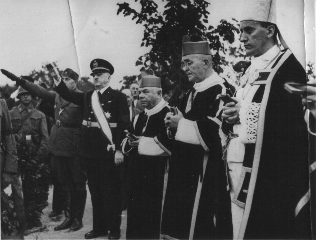 1. Što je već 12. travnja 1941. godine, dok su se još vodile borbe sa njemačkim i talijanskim okupatorskim trupama posjetio u svojstvu hrvatskog metropolite „vojskovođu“ Slavka Kvaternika i čestitao mu uspostavu tzv. NDH, 16. travnja 1941.god. izvršio je službenu posjetu krvniku Paveliću, i prvih dana okupacije priredio je u nadbiskupskom dvoru večeru ustaškim emigrantima i zajedno se s njima slikao.